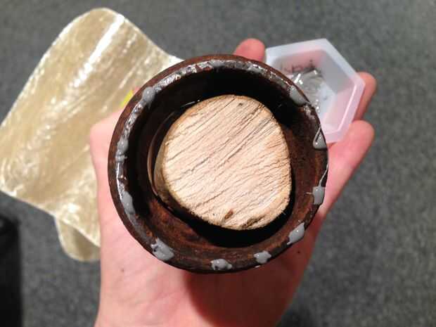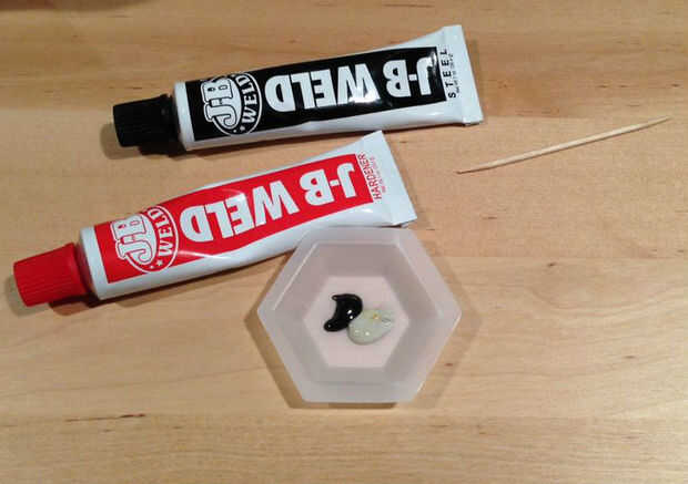 hice igual puntos de acero epoxy y el endurecedor en un plato pequeño de plástico. Luego usé un palillo para mezclar los dos y hacer pequeños puntos alrededor de la parte inferior de la parte superior de la base antes de presionar en la parte inferior de la base y dejando solo por 24 horas.