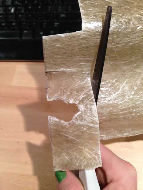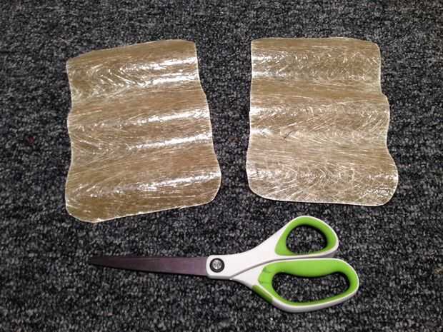 corté dos piezas que son de 8 x 5 pulgadas. Los corté para que tuvieran tres canales para pendientes en. Empecé haciendo cortes verticales, y cuando las tijeras tuvieron un tiempo difícil mover más, hice cortes horizontales para aliviar la presión.