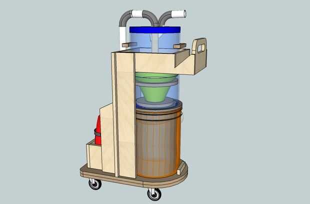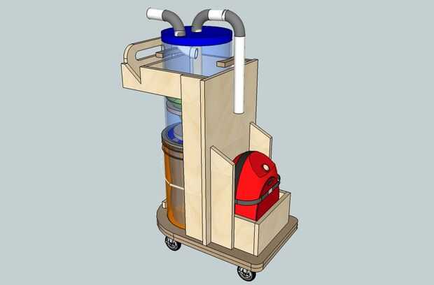 El diseño del carro es muy simple y se puede hacer con madera contrachapada solamente, no hay dimensiones aquí porque usted tendrá que medir y ajustar según diámetro del cubo y la forma de la aspiradora.