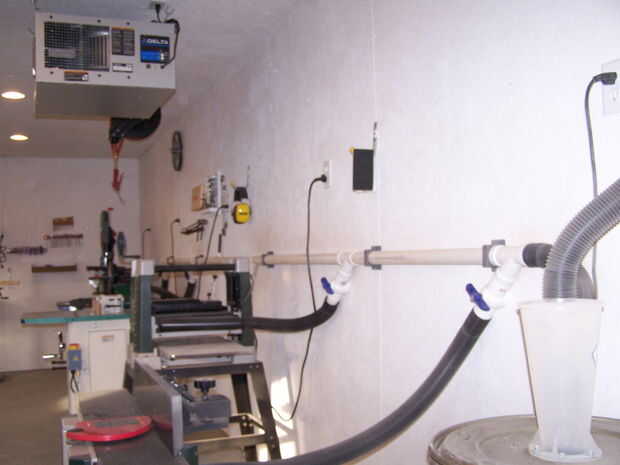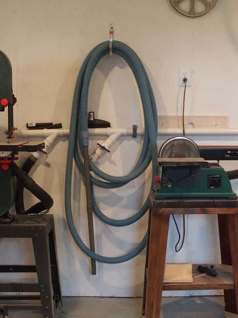 Sustituyó el sistema de vacío pequeña dedicado en mi sierra de mitre con una extensión funcionó en el techo. La aspiradora $20 nunca ha manejado el flujo de aire generado por la sierra. Salí de la válvula en el otro lado de la habitación, verdad no es tan práctico, pero puedo alcanzar a lo fácil de esta manera y esto me permite poner el tubo flexible de vacío alto en la pared para la trayectoria de giro de la sierra. También corrí un tomacorriente dedicado en la pared de la Sierra del circuito detectado a través de la habitación para las otras herramientas en el sistema de vacío. Otra vez, ya que uso solamente para una herramienta a la vez, hay un montón de capacidad del sistema eléctrico y de vacío.
