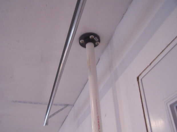 Decidí anclar el tubo de PVC va por el techo utilizando una brida de piso para el conducto eléctrico y taladrar un orificio para el PVC, y luego pegado del PVC en el lugar. También se utiliza una abrazadera sobre el techo en PVC.