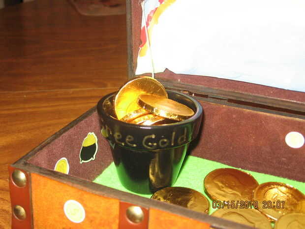 A continuación, llene la olla con chocolate monedas de oro, también hemos añadido algunos a la parte inferior de la caja, de esta manera seguirá el oro a la "carga de la madre".
