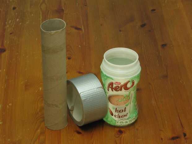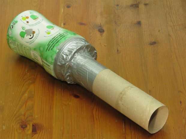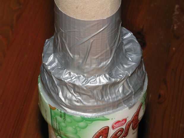 Construcción no podía ser más sencilla - cocina rollo de tubo, recipiente de plástico, cinta aislante. Ponerlos juntos según la foto.