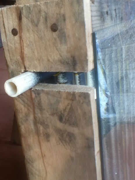 Adjunto/pegué longitudes de tubería en la salida y entrada luego marcado en la caja del cajón de donde cortar. Utilicé una sierra de calar para cortar una ranura para la matriz ir dentro de la caja. Esta ranura puede ser cubierta y aislada más adelante.