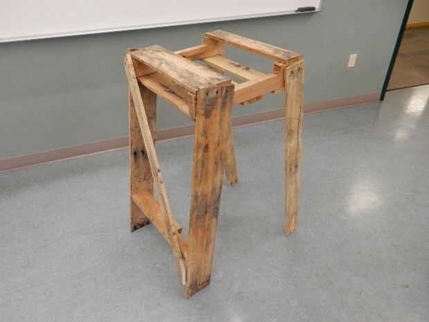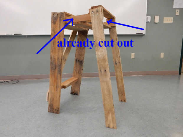 La plataforma ya tenía muescas que corte mi tanque de ajuste en (ver imagen). Tan sólo cortar la esquina de la plataforma y desmontar las tablas del resto de él para clavar juntos el stand. He podido reutilizar los mismos clavos. También montara las piernas en ángulo hacia afuera y usar la planta de trazado y corte de las piernas para ser plana en la parte inferior para mayor estabilidad.