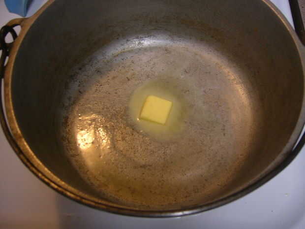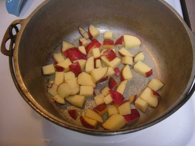Empiezo con un poco de mantequilla y las papas (picadas, por supuesto). Las patatas tienen el tiempo de cocción más largo, así que golpeándolas con mucho calor ayuda a kick a empezar todo.