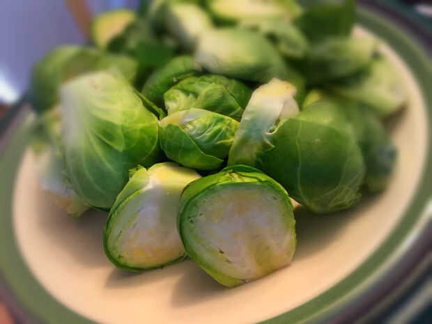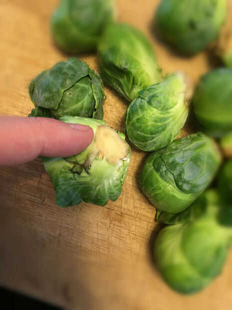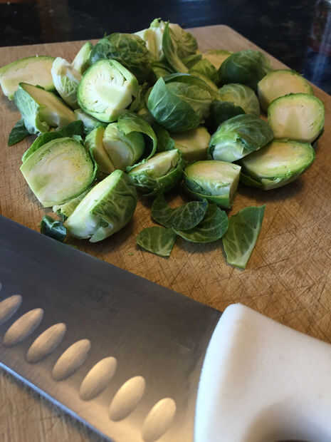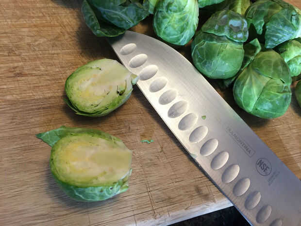 Mientras se está calentando la sartén, preparar sus coles de Bruselas en la tabla de cortar. Cortar el extremo del tallo y cortar el brote por la mitad longitudinalmente. Deseche los extremos del vástago. Coloque los brotes en un plato o en un recipiente, necesitarás una tabla de cortar otra vez para cortar encima del tocino.