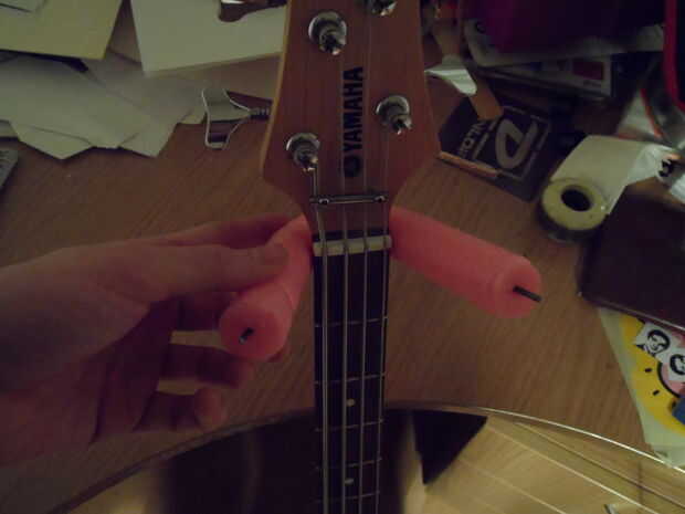 Esta es una guitarra muy simple para practicar cuando se necesitan un tamaño mínimo, guitarra tranquila, como en una habitación de hotel etc.. Se hace cortando encima de una guitarra barata, así que la longitud de la escala, cuello ancho, etc. es lo