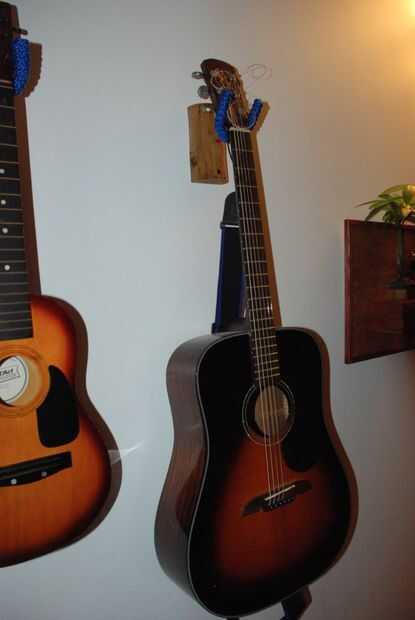 Construido un colgador de guitarra simple de un registro y unas cañas. Tengo un stand de guitarra pero ocupa espacio en el piso y con los niños corriendo no seguro ya. Tengo unos registros de colocación alrededor y cuando comprobé que estén limpios y secos, ahora tengo una idea para una placa de cara de la guitarra.