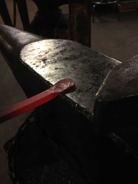 Quitar metal de forja tenazas. Sujete el extremo con sus pinzas firmemente y coloque el metal de cerca de 1 pulgada de superposición con el borde del yunque. Golpear el metal con el martillo con golpes constantes, superpuestas. Le dará un buen hombro y un espacio plano para montar su suspensión a la pared.