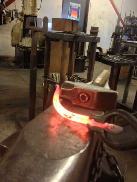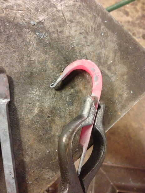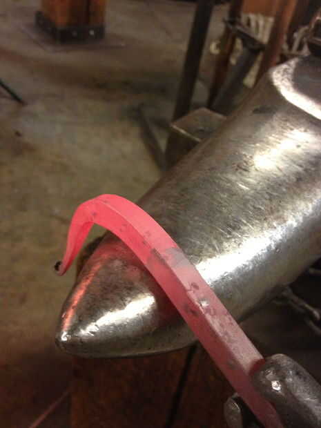 Gire su material 180 grados y ligeramente comienza a curvar el material sobre el cuerno del yunque. Utiliza golpes de refilón y golpear justo sobre el borde de la bocina, sin golpear directamente en él. Está creando una suave curva que se forma en forma de J.