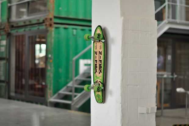 Buscaba una solución fácil colgar muy bien mi colección de longboards y cruisers. Yo también quería tener al lado de gráficos visible y un discreto colgante sistema. Ya que a menudo uso imanes en oficina (se hace de un contenedor), me pregunté si era posible colgar un tablero vertical, con imanes colocados en los pernos...