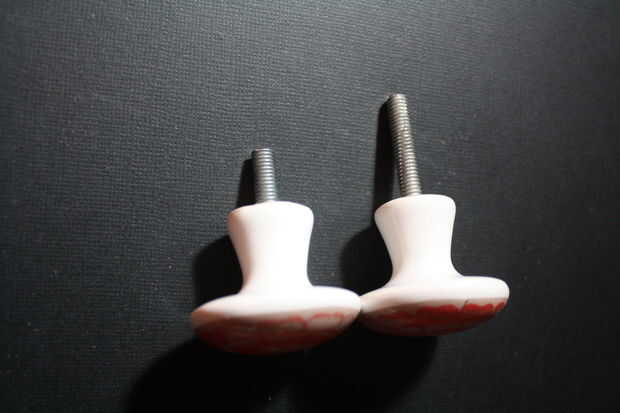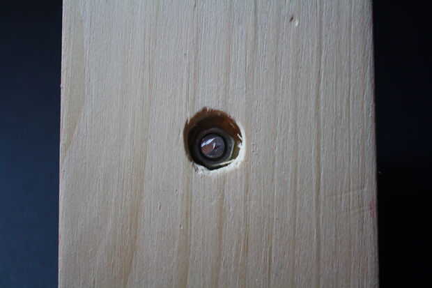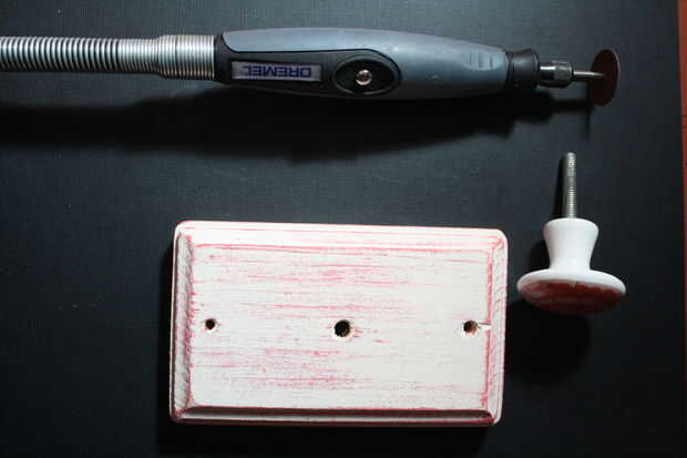 Con el Dremel, ajuste el perno de perilla a aproximadamente 3/4 de pulgada (o ajuste) para que el tornillo quede en el orificio hecho en la parte posterior. Luego coloque la perilla en el agujero y apriete firmemente la tuerca.