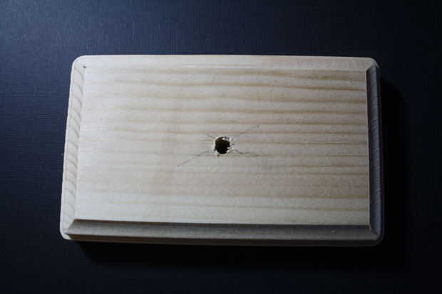 Primero necesitamos a donde van los agujeros de la medida. Tomar la regla y medida de cada diagonal y haga una X en el medio. Esto es donde irá el agujero para el botón. Usando la broca de 11/64, taladre a través de todo el camino.