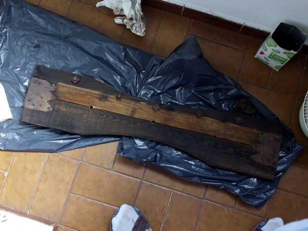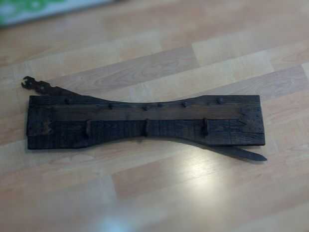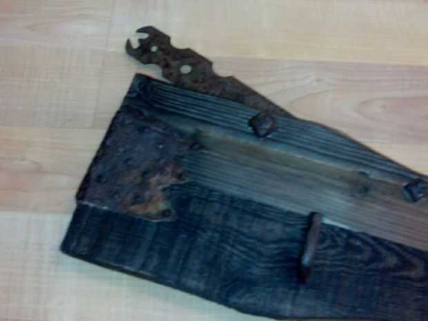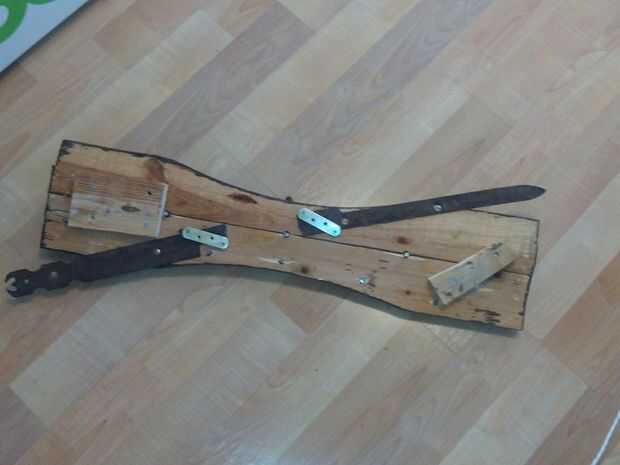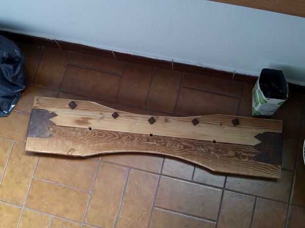no tiene mucha complicación hijo dos lamas de un pálido teñidas con un tinte grisaceo y unos hierros viejos encontré por la casa del pueblo son unos ganchos, unos tornillos (las tuercas cuadradas) y un refuerzo decorado de hierro forjado de una puerta antigua