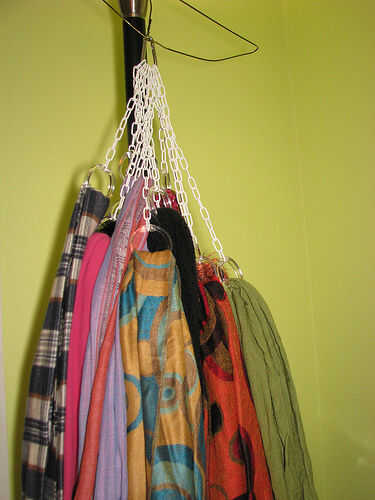 Usted podría comprar uno de los muchos tipos de suspensiones de bufanda, pero los que he probado son a menudo demasiado trabajo (para guardar, para encontrar la bufanda que desea) o toman demasiado espacio o son demasiado caros. El boxeo es también una opción (todo en una caja, o cada uno en su propia caja), pero tengo espacio para colgar objetos, menos para dejar de lado los.