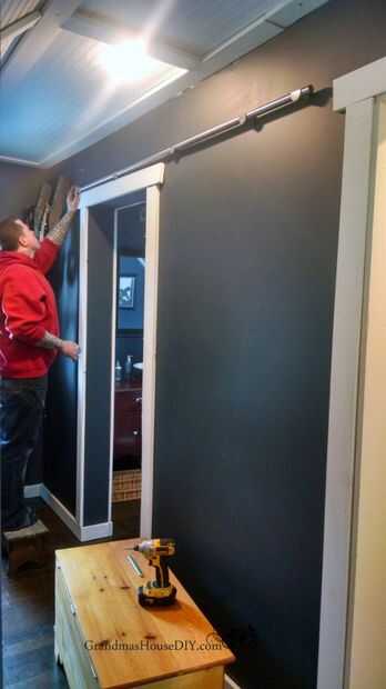 Con las ruedas en la parte superior de la puerta adjuntadas tomó nuestras mediciones entonces encabezada por escaleras con nuestro nivel de seis pies para decidir dónde colocar los cinco soportes para la barra. Esto fue tan simple como una línea de nivel de dibujo en la pared y luego agregarlos en, tres de ellos fijada a los birlos, los otros dos se utilizan anclajes de roca de hoja. Luego coloque la varilla en posición y había asegurada por medio de los montes.