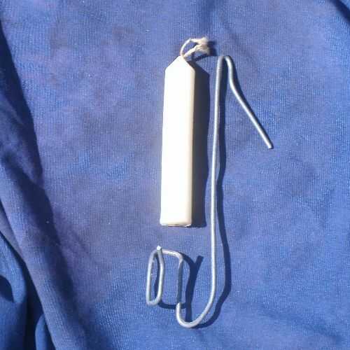 Está doblado de tal manera que tres secciones paralelas del alambre excavan canales en la vela cuando se presiona en su lugar. Que sostiene firmemente la vela.