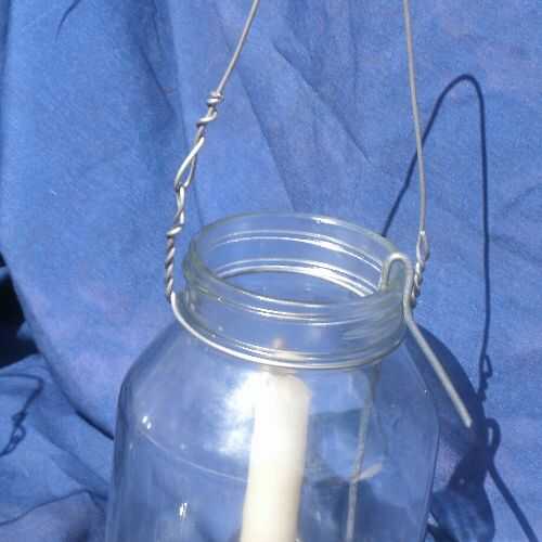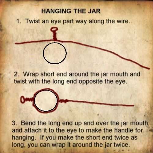 Torcer un ojo en el cable en primer lugar, que se utilizará en la fabricación de la manija. Consulte el diagrama. La sección del cable que sostiene la jarra envuelve una vez alrededor de la boca del tarro y giros con sí mismo en el otro extremo del ojo. Usted puede envolver alrededor de dos veces, si piensas hacerlo es más seguro. Pase el extremo libre del ojo para completar el mango.