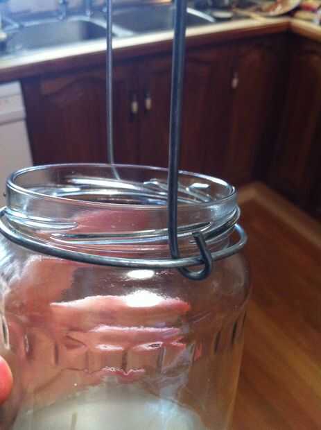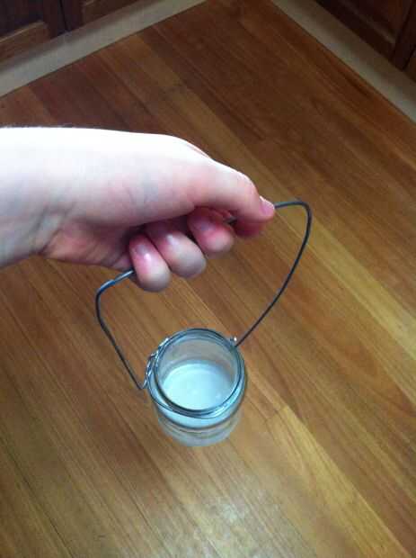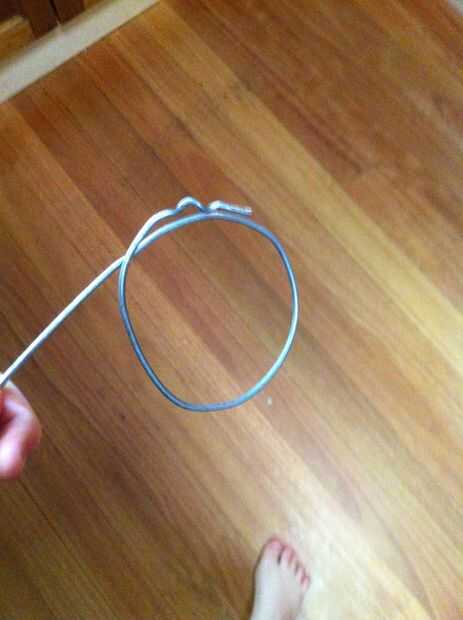 luego formar un círculo, curva 90degrees, para el mango a la longitud deseada (Recuerde cuando su encendido será caliente directamente encima) y doblar hacia abajo otra vez. Ponga el extremo entre el círculo y la jarra y formar un lazo (ver imagen).
