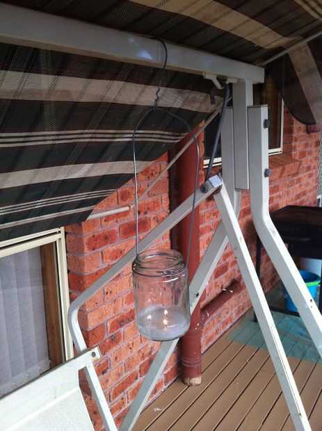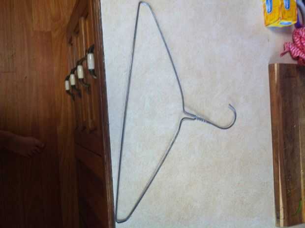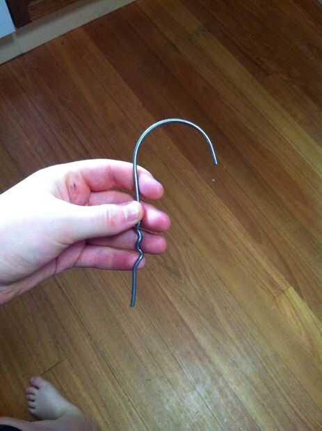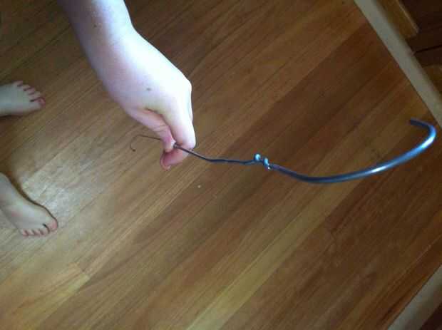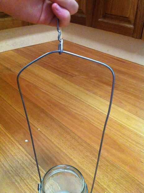 Hacer una curva en la parte superior del mango (foto) y doblar un bucle en el vástago del gancho alrededor de la manija de la linterna.