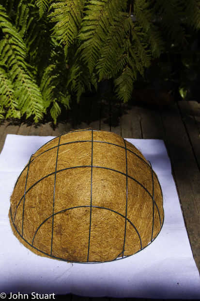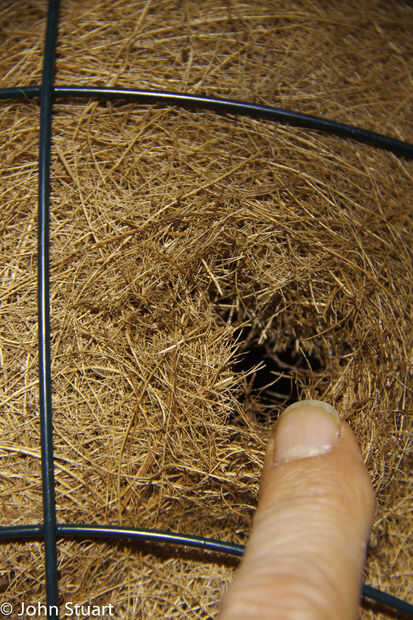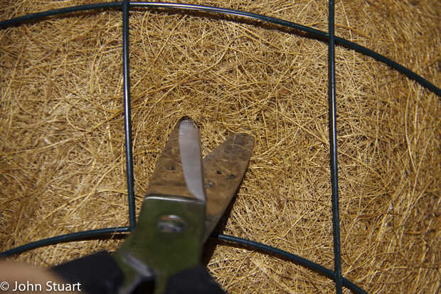 Usando la punta de la puñalada de tijeras por el forro de coco entre los cables y luego corte una cruz bastante grande para empujar su buscador suavemente y en ampliar el corte para que tenga un pequeño agujero