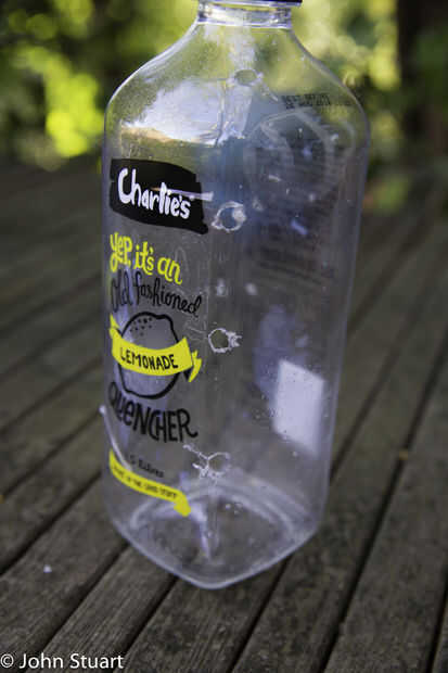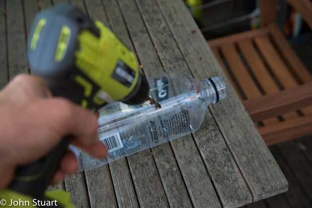 Perfore agujeros en los lados de la botella de plástico. Bajé las esquinas haciendo dos orificios en el lado y uno en el cuello de la botella. Para ello en las cuatro esquinas. Se tienen 12 agujeros en todos.