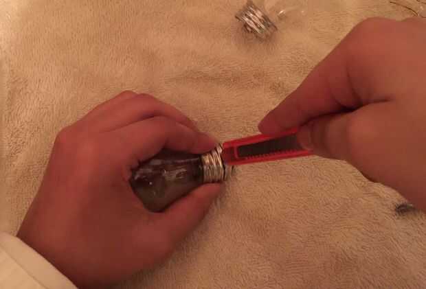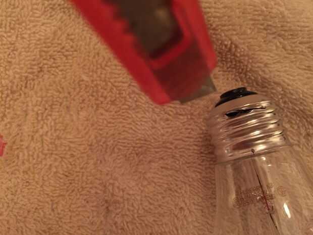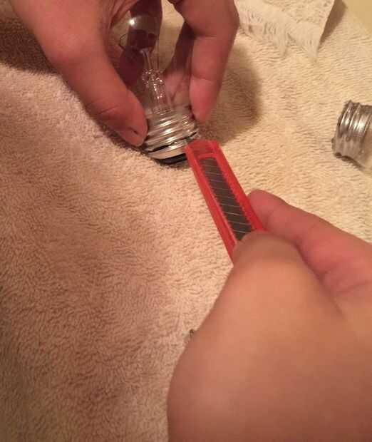 Para este paso tomé el cuchillo penetra un agujero a través de la base de la bombilla y corte alrededor hasta la parte superior estaba apagado.