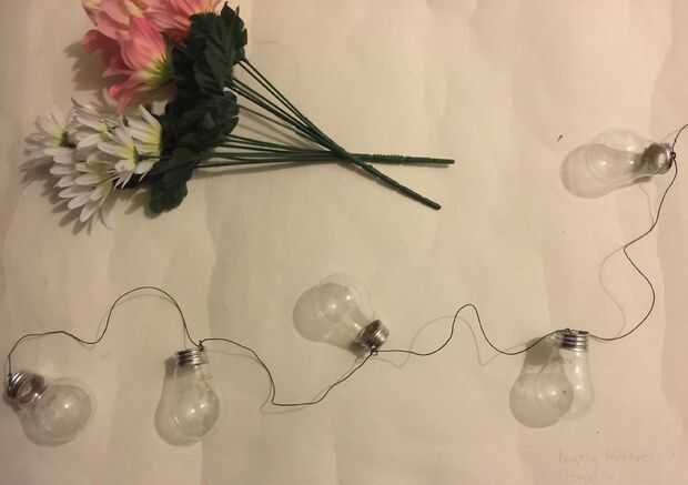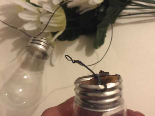 Para pasar el cable de la bombilla poke un pequeño agujero en la base con su cuchillo y usar el alambre para hacer un nudo. Uniformemente espaciar cada bulbo y continuar atar cada bulbo hasta que no tenga cualquier izquierda.