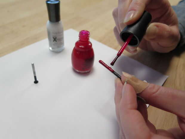 Uso del pulimento de clavo u otro a la pintura de los tornillos rojo, el uno blanco y dejó la pintura seca mientras están trabajando en los siguientes pasos. Si desea saltarse este paso, también puede marcar un tornillo con un trozo de cinta roja en vez de pintando.