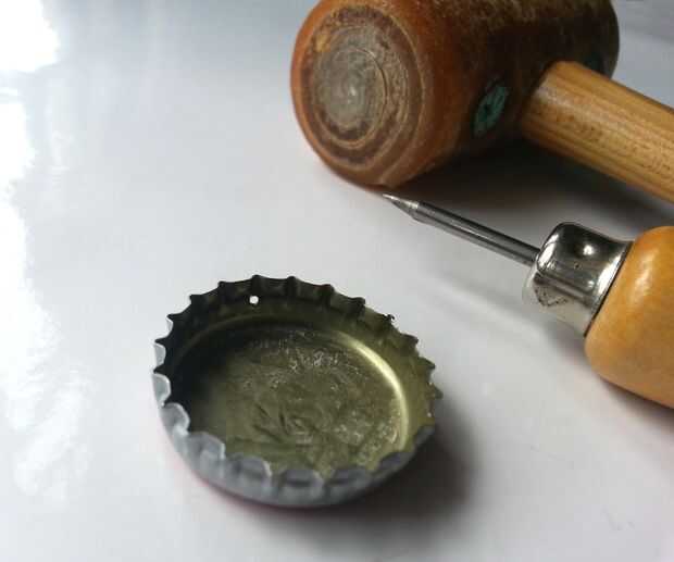 Utilice el punzón y martillo para hacer un agujero en la tapa de la botella para colocar el anillo del salto (para el colgante).