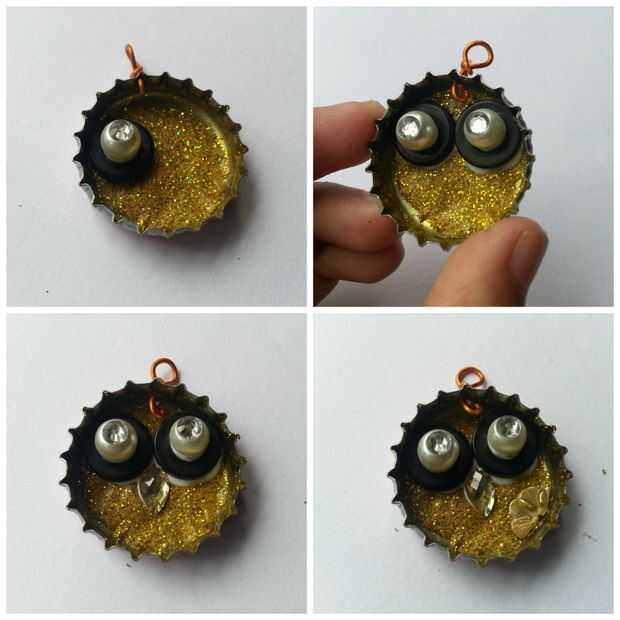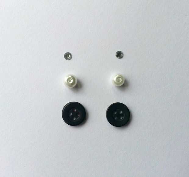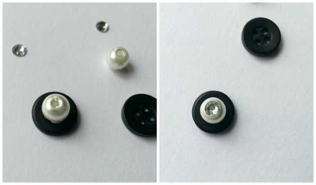 Usé botones, pequeñas perlas y piedras para hacer los ojos, ver la primera foto de este paso. Pegar las perlas y piedras en el botón igual (Foto-2 de este paso).
