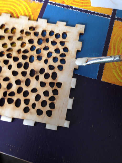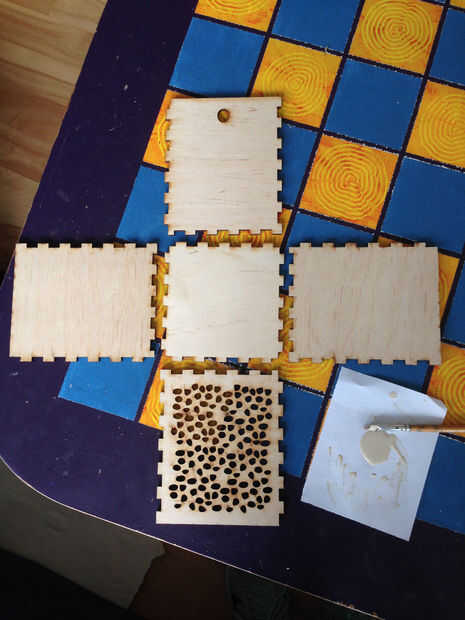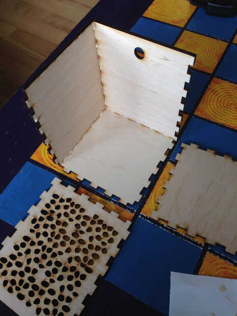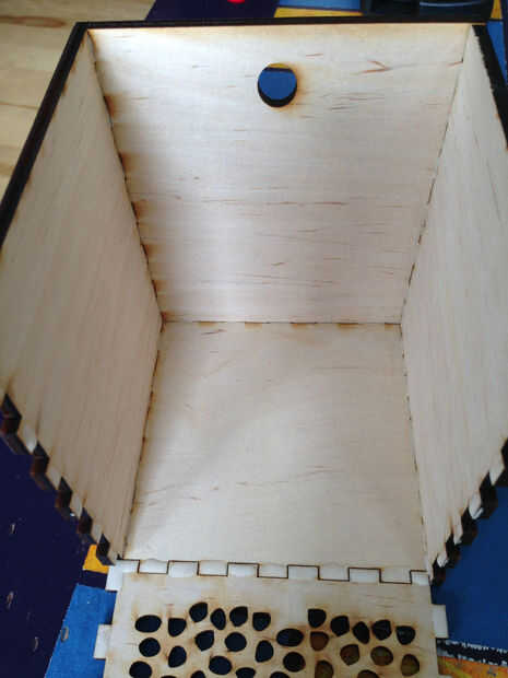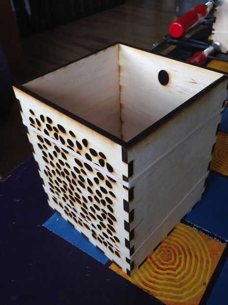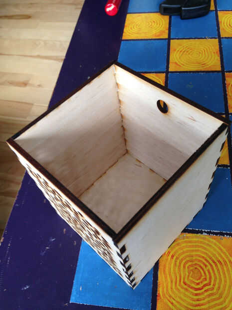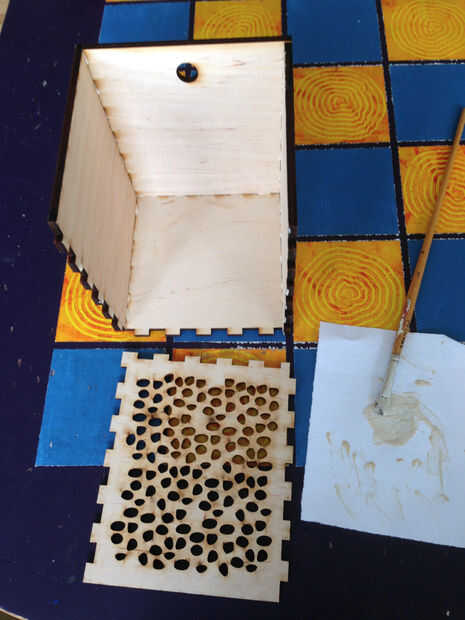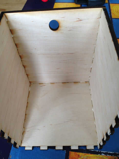 Con las muchas articulaciones dedo en este cuadro, puede ser mucho tiempo para pegar cada borde que entre en contacto en una articulación y hacerlo perfectamente! Experimenté en esta Asamblea, con sólo pegar las tapas de las lengüetas en cada empalme (ver foto). Encontré que esto trabajó bien, y como un bono, parecía mantener la mayoría de cualquier exceso de pegamento en el interior de la caja.