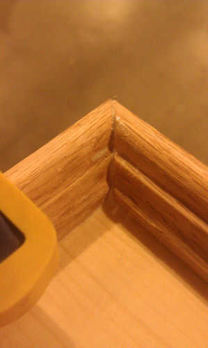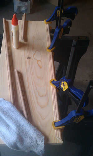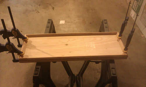 Simplemente se trata de pegar las piezas sobre la cara de la Junta de la cabecera. Sólo tengo cuatro abrazaderas por lo que tuve que pegar las dos piezas largas en pasos distintos pero si tienes pinzas más no dudes en hacer a la vez. Lo mismo con las piezas laterales. Aconsejaría contra hacer una tapa o pieza del fondo con tanto/tanto de las piezas laterales porque tratando de manipular que muchas pinzas mientras que las piezas de deslicen por el pegamento va a causar frustración y un lío.