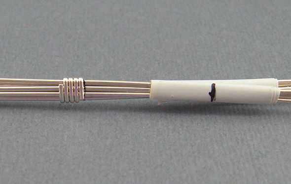 Mantenga los dos paquetes juntos asegurándose de que las marcas estén alineadas. Envuélvalas junto con el alambre redondo de media. Comience envolviendo en la línea en el paso anterior y va del centro de la envoltura.