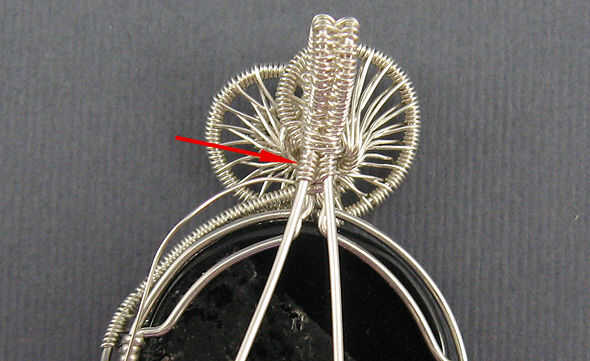 Corte 4' otro trozo de alambre de 28g. Envuélvalo alrededor de uno de los cables que salen en la parte inferior de la espalda de la fianza (el uno que no estaba envuelto en el último paso. Empuje el cable g 28 contra la parte inferior de la.