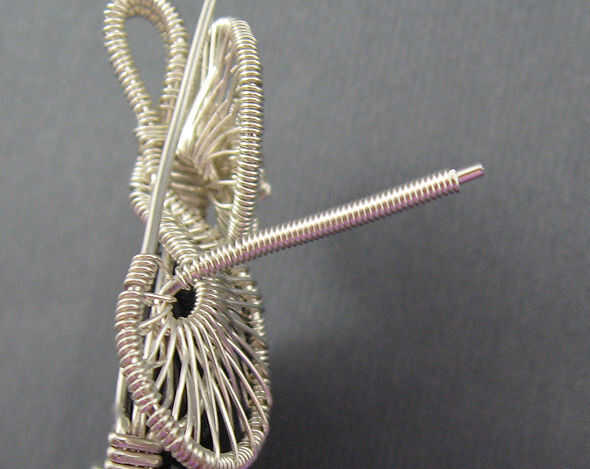 La curva interior con el fin de tejer cable a aproximadamente 5/8" largo de bobina. Corte el cable de la bobina y presione cerca del cable de 20 g. Corte el cable de 20g 1/8" por encima de la bobina de y archivo liso.