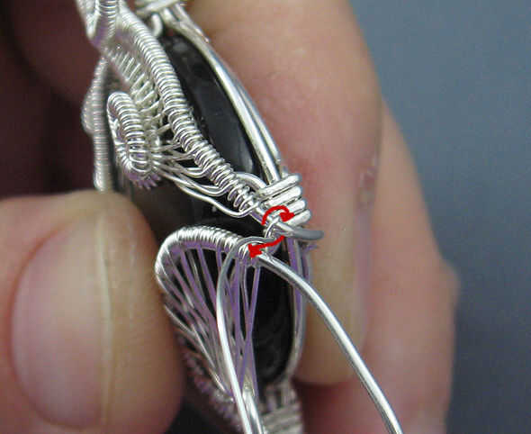 Subir el alambre sobre el alambre exterior de la curva de la espiral en la parte superior, introducir detrás el alambre exterior de la curva de la espiral superior y traer copia de seguridad entre los dos hilos como si fueron tejiendo los dos cables juntos.