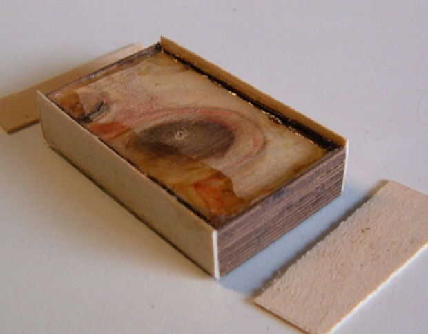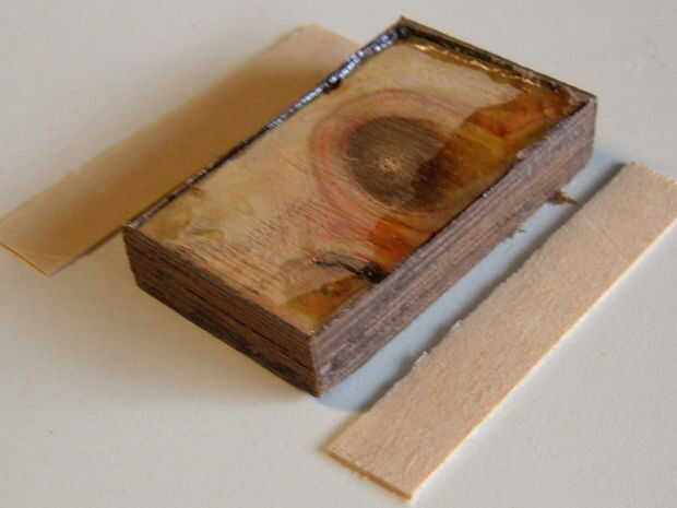 Cortar dos piezas de la chapa de arce sólo un poco más ancho y más larga que los bordes laterales de la botonera y luego pegar. Después de establece el pegamento, recorte los extremos al ras con los lados cortos de la botonera. Ahora, corte dos piezas de la chapa del arce apenas más larga y más ancha que los bordes cortos. Pegamento entonces.