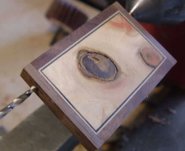 A continuación, llega el momento para perforar. Esto es imposible con un taladro de mano y casi imposible con una prensa del taladro porque estas brocas pequeñas tienden a divagar un poco y soplar hacia fuera el lado tiene una alta probabilidad de que ocurra.