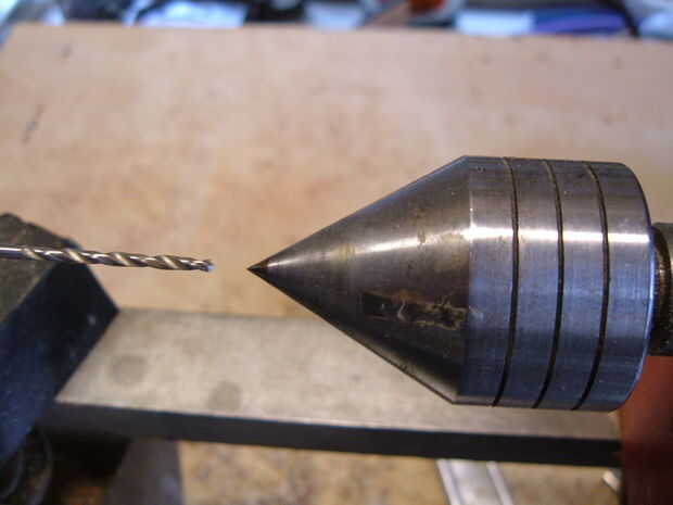 Yo en mi torno taladro. Primera marca de ambos lados donde taladrará el agujero. A continuación, utilizar un golpe o un clavo para hacer una pequeña muesca para iniciar el agujero. Luego pongo la broca en una muesca y el centro del cabezal móvil en la otra. Ahora encienda el torno y avanzar la vaina. Que comienza el agujero. Perforar a mitad de camino entonces invierta la pieza y el resto del camino desde el otro lado del taladro.