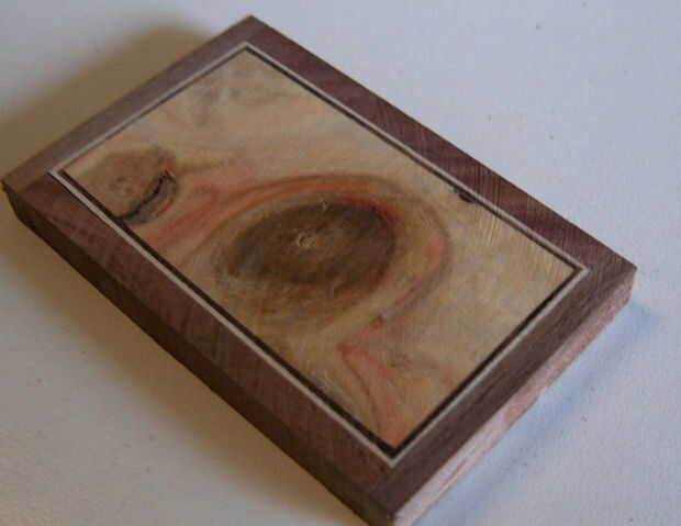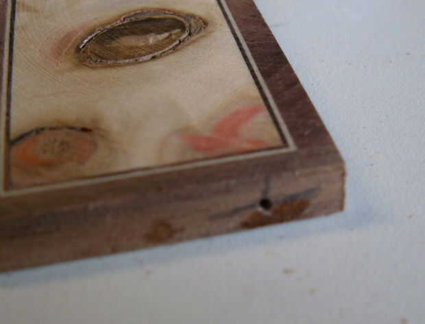 La chapa y el marco pegado en son más anchos que el colgante. Ahora es el momento para ambos lados de la arena al ras.