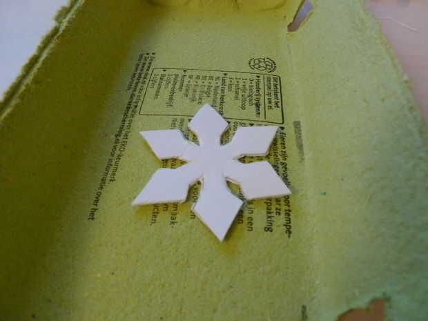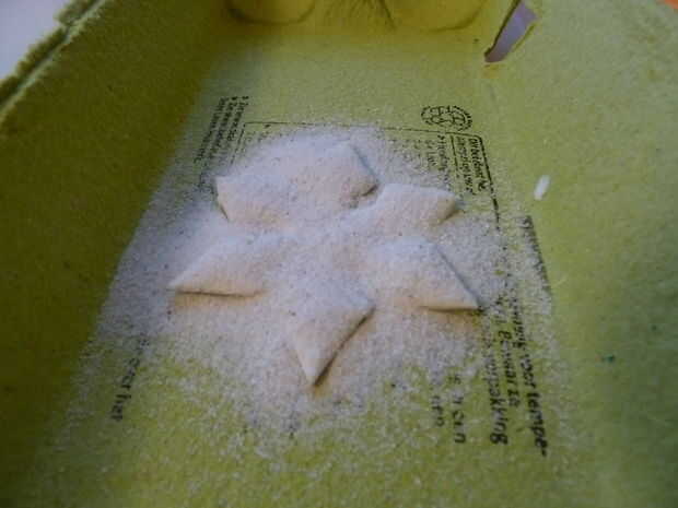 Coloque su copo de nieve en algún lugar que tiene más lados. Usé la parte superior de un cartón de huevos vacío. Esto le ayudará a mantener tu escritorio limpio cuando usted está agregando la arena. Una capa de laca del papel para el copo de nieve y añadir la arena. Es más fácil añadir un poco más, la parte que no se usa sólo puede utilizarse una otra vez.