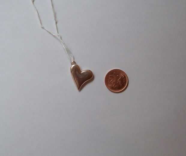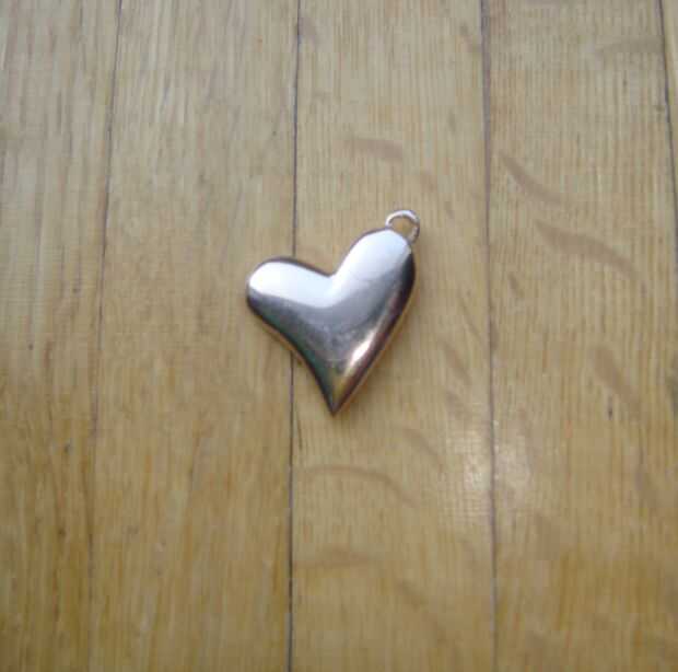 este colgante en forma de corazón primero comenzó como un dólar de plata de 1963 canadiense. Se trataba de plata 80-20 de cobre. La forma áspera se hizo utilizando la técnica de cera perdida y después de horas de presentación, fue terminado de lijar y pulir el producto final. Fue hecho para mi novia para nuestro aniversario.
