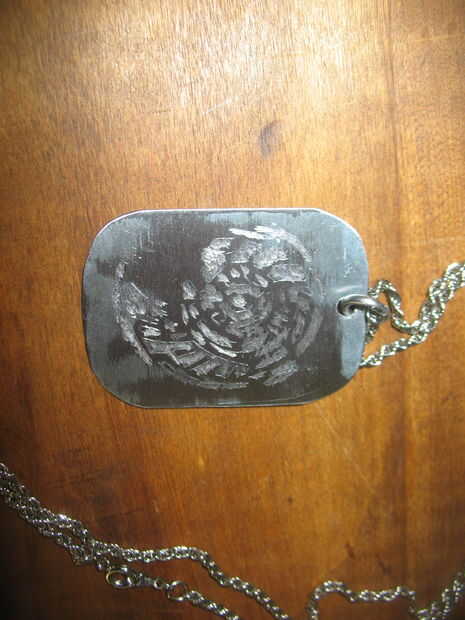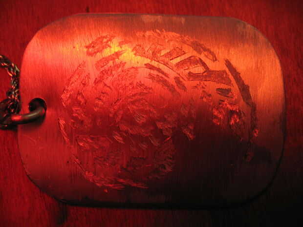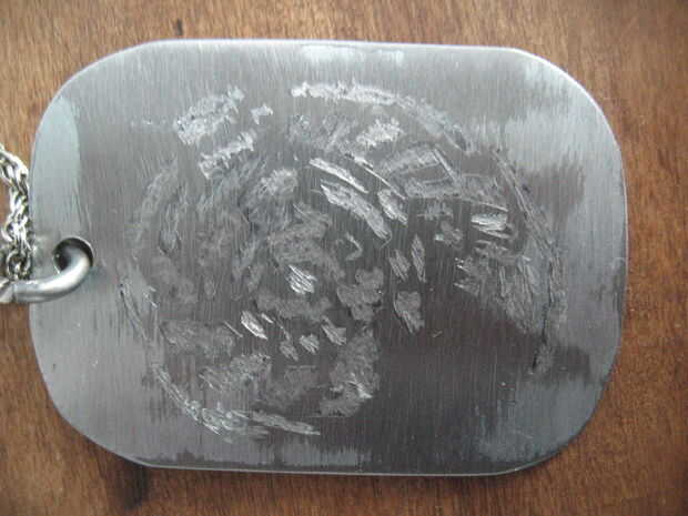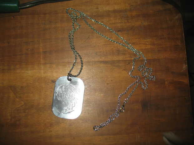 Empecé con un trozo de chapa de acero galvanizado 1/16" y luego utiliza una amoladora para cortar un rectángulo de áspero. A continuación, usé una esmeriladora de banco para suavizar las cosas para arriba y alrededor de las esquinas. Después de eso, volví a la amoladora y la tierra los pequeños "chips" de la superficie (sabes lo que estoy hablando, ¿verdad? Ese tipo de cosas que hace el metal aspecto moteado). Una vez que fue hecho, utilicé el método para la aplicación de la plantilla descrita por Kactapuss en el "Presupuesto Exacto cuchillo Metal grabado". He seguido las instrucciones hasta el punto donde uno comenzaría grabado con el cuchillo antes mencionado. Sin embargo, en lugar de utilizar el exacto para grabar el logo en el metal, engañado y había utilizado una broca de grabador en mi dremel handy dandy. Para terminar cosas, hice un anillo de saltar de una percha de alambre y encadenan el lote en una cadena que tenía ahí.