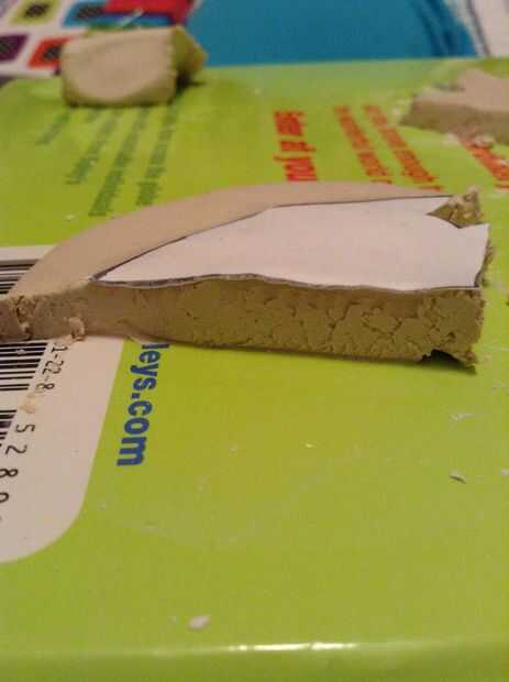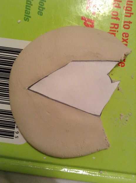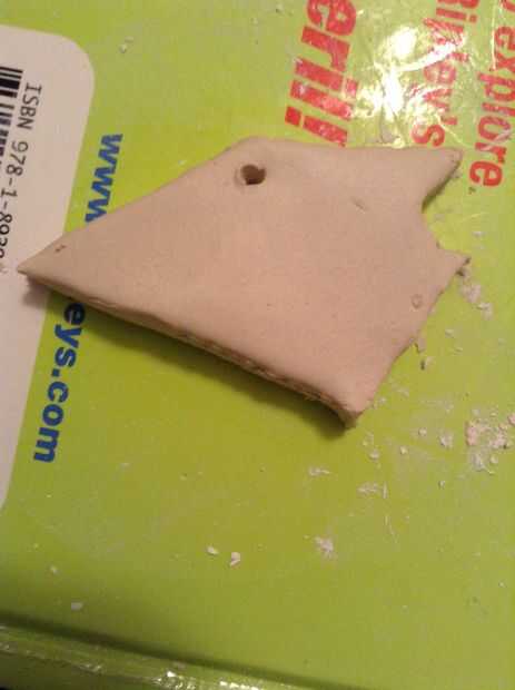 Tomar la herramienta puntiaguda y cortar todo el colgante, alisando los bordes mientras avanzas a lo largo. Tire la arcilla sobrante al trabajar alrededor de él. Una vez que la forma es cortar completamente, retire el papel. Realizar ajustes finales en la forma como suavizar los bordes otra vez. Tomar un alfiler o la herramienta puntiaguda y hágale un agujero donde quieres que cuelgue desde el collar.
