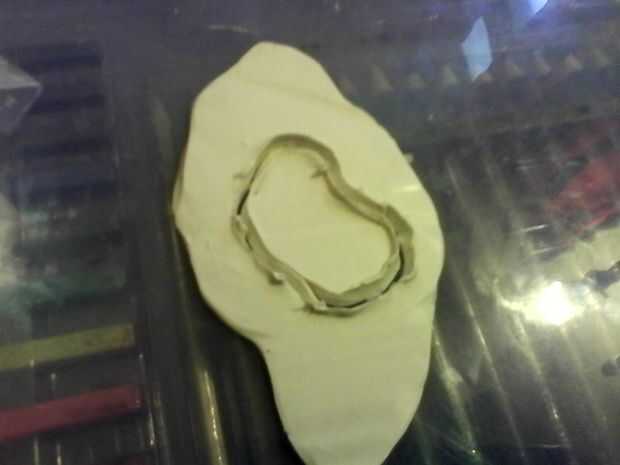 Usando un cuchillo de arcilla, u otra herramienta de borde afilado para cortar la forma de tu colgante hacia fuera. Mi cuchillo no es muy bueno sin embargo.