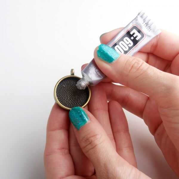 Inicio por que cubre el interior del colgante con una capa de cola. No tienes que llenar completamente la base, pero asegúrese de que hay una capa generosa por lo que las fichas se fije.