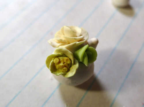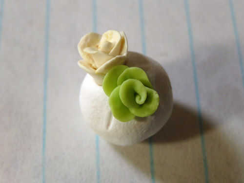Antes de pegar flores en la base, se puede aplicar algunos sculpey líquido translúcido a cada flor para actuar como un pegamento. Porque las flores ya se cuecen al horno, estará menos pegajosas y hará el TLS que realmente se adhieren en.