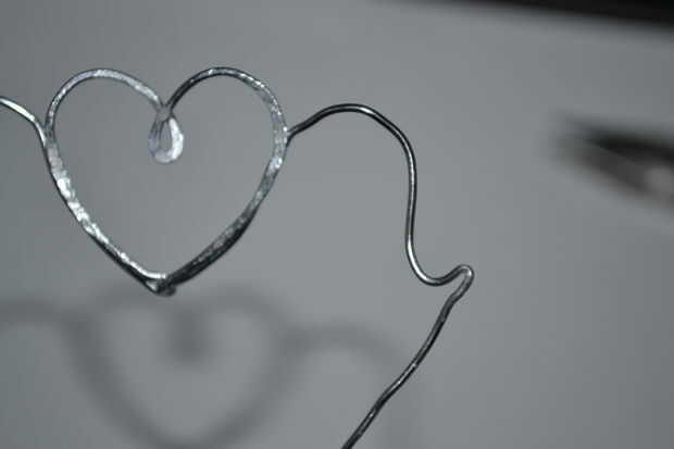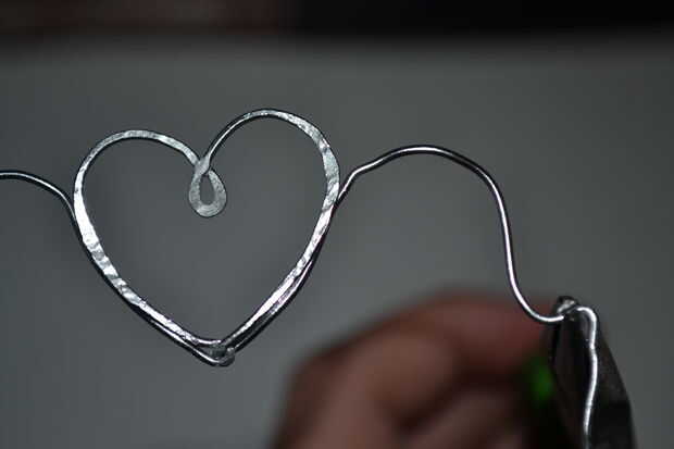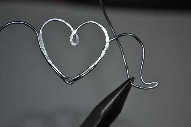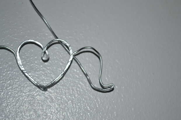 Al final de la curva que acaba de realizar, utilice unos alicates para doblar el alambre en la punta del ala. Luego doblar hacia el corazón. Utilizar las fotos para más instrucciones sobre cómo hacerlo.
